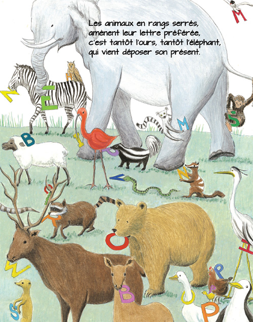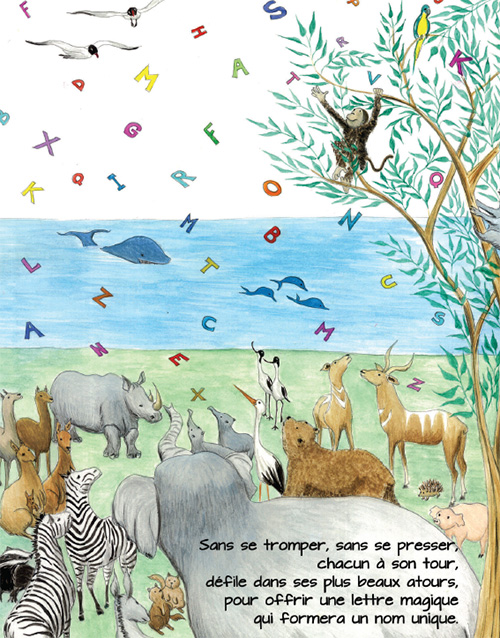 Les animaux réunis dans la savane ont décidé d'offrir à l'enfant qui est né, des lettres pour former son prénom et son nom uniques. En fonction de ceux-ci, des bêtes, comme par exemple, le Lion, accompagné d'une comptine, va lui apporter son L, le Singe, son S, la Vache, son V…. Vous allez faire rêver votre merveille en lui faisant découvrir toutes sortes d'animaux, en lui lisant les comptines et en lui apprenant à reconnaître les lettres de son nom.